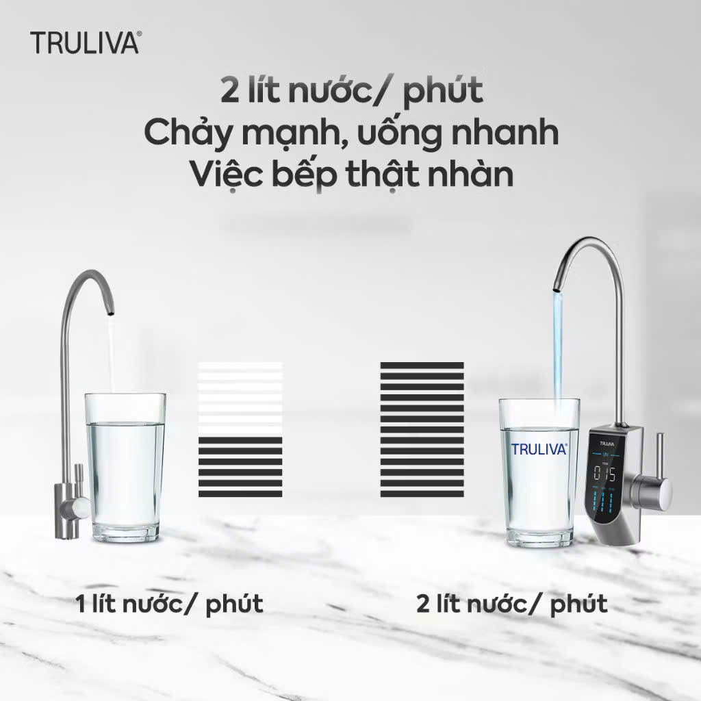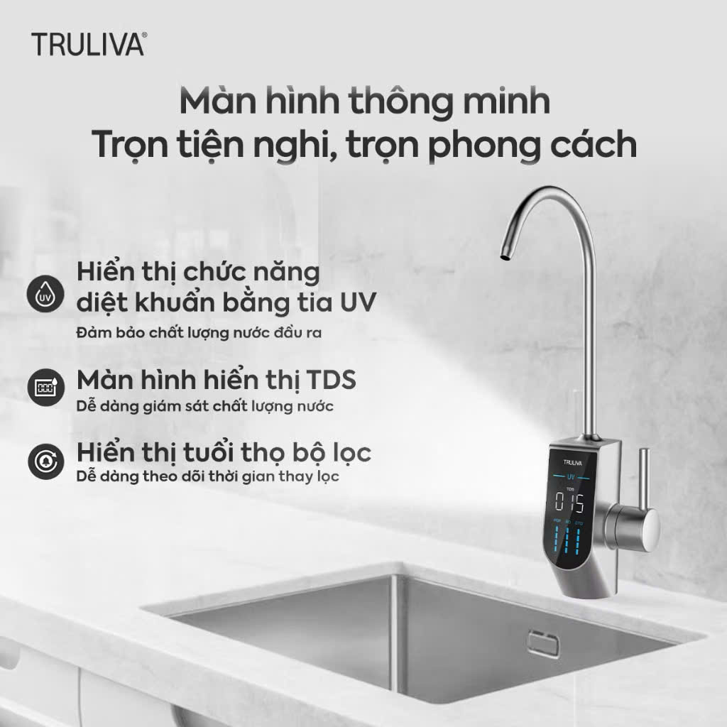 Công nghệ TRU-TECH PLUS™ loại bỏ 99% vi khuẩn, vi rút, kim loại nặng, hợp chất hữu cơ. Tốc độ lọc 2 lít/phút đáp ứng đa dạng các nhu cầu sử dụng nước sạch & Vòi tích hợp UV, màn hình điện tử thông minh
